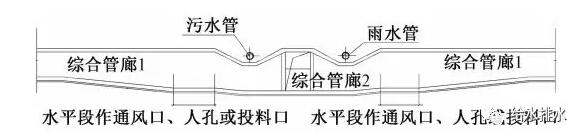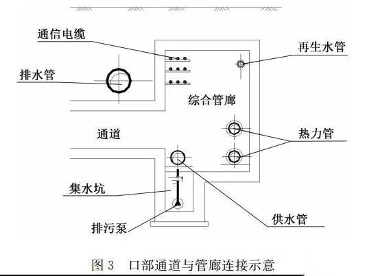 (1)通風(fēng)口、人孔及投料口等口部與管廊之間的通道和其他管線交叉時,綜合管廊向下折翻,既要確保通道凈高(不小于1.5m)的前提下保證通道頂在排水管以下(每一處都要結(jié)合排水管網(wǎng)施工圖詳細(xì)計算),又要避開通道在管廊開口處的管線遮擋以免局部管廊埋深和凈高加大。為減小管廊局部下臥深度,以便減小施工難度、降低建設(shè)投資,各口部及通道均設(shè)在給水及電信線纜一側(cè)。口部通道與管廊連接示意見圖3。