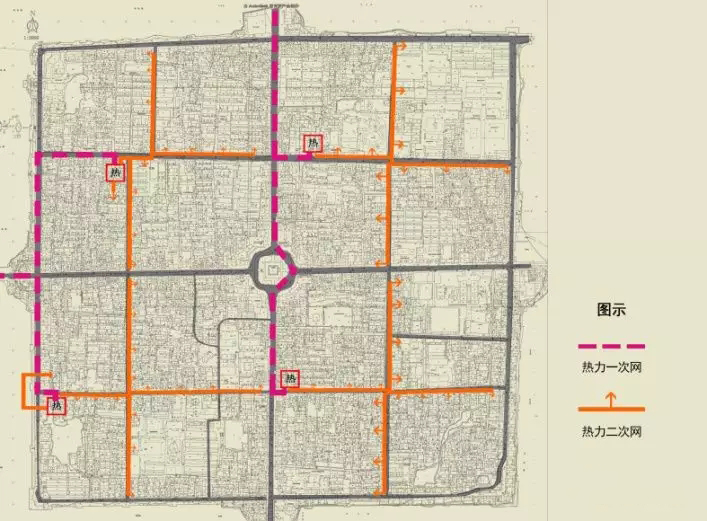 熱力管線規(guī)劃為從古城區(qū)北城門和西城門各引入一路市政一次管網(wǎng),直接敷設(shè)在4條大街的管廊內(nèi);在4個片區(qū)各建設(shè)1座熱力站,經(jīng)換熱處理后的二次管網(wǎng)仍然要在管廊內(nèi)敷設(shè),再接至各組團(tuán)內(nèi)的取暖用戶。