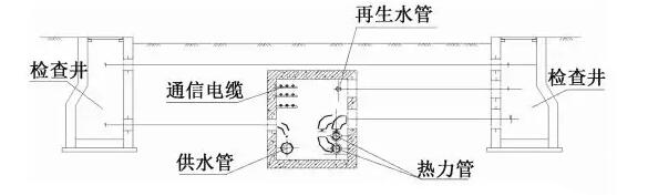 廊內(nèi)一側(cè)敷設(shè)給水管道及通信電纜,給水管在下,通信電纜在上;另一側(cè)敷設(shè)熱力管道,其上方預(yù)留熱水及再生水管線安裝條件;廊內(nèi)中間考慮0.9m的檢修通道。