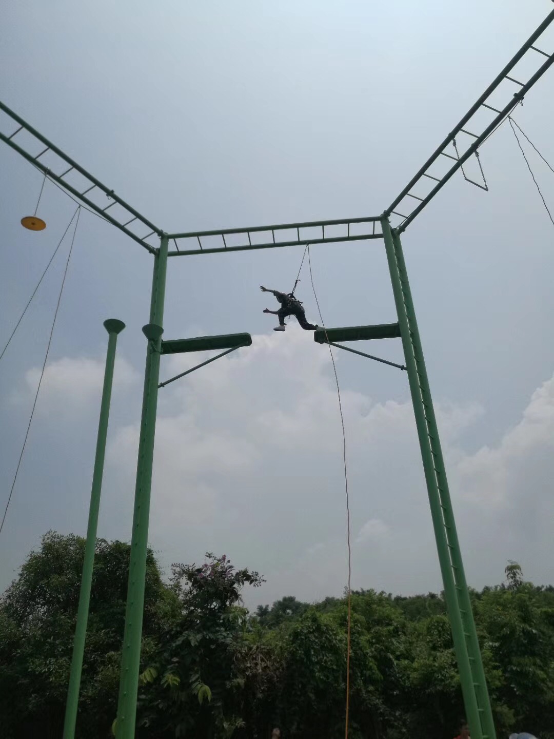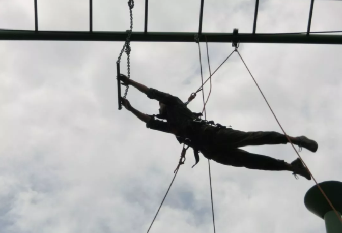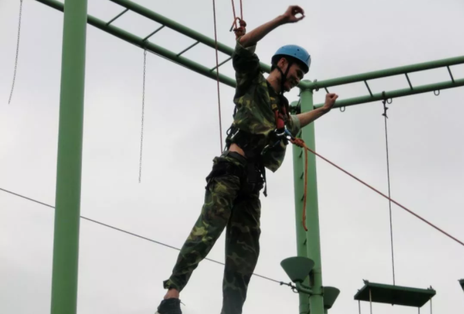 空中單杠是一項(xiàng)自我挑戰(zhàn)的高空高難度項(xiàng)目,隊(duì)員需要在9米高臺(tái),直徑25公分的圓臺(tái)上站立,奮力跳躍抓住空中的單杠。挑戰(zhàn)自我,客服心理障礙,培養(yǎng)自信心。面對(duì)機(jī)遇,能果斷把握,增強(qiáng)自我決斷的能力,以積極冷靜的心態(tài)去爭(zhēng)取。樹立對(duì)困難、對(duì)問題不懼不卻以及挑戰(zhàn)的魄力。